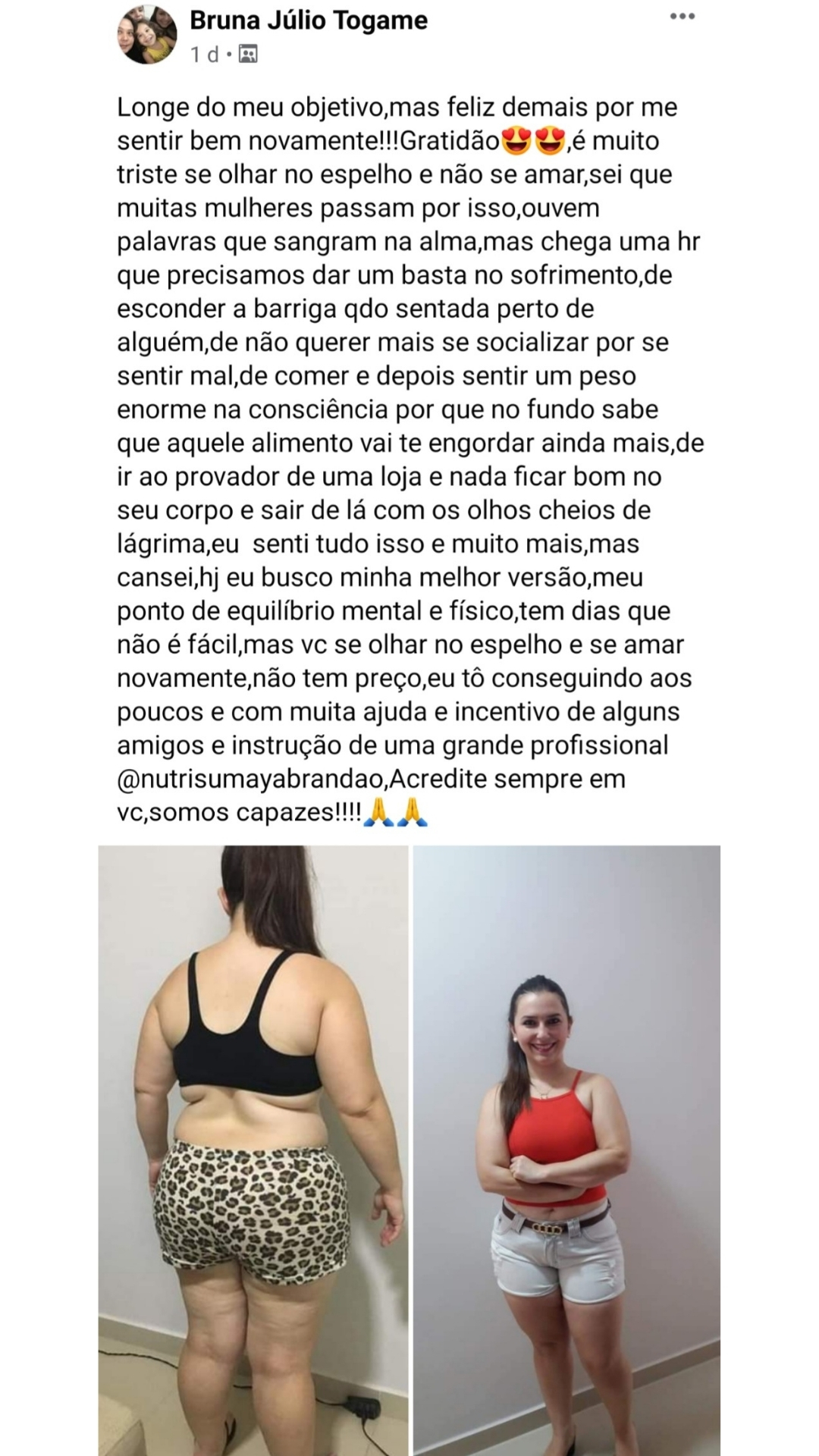 Resolvi mudar minha vida e decidi fazer nutrição, justamente por querer emagrecer e manter um peso onde eu me sentisse bem, feliz com meu corpo e perder a vergonha. Afinal eu era uma adolescente, que morava na praia.